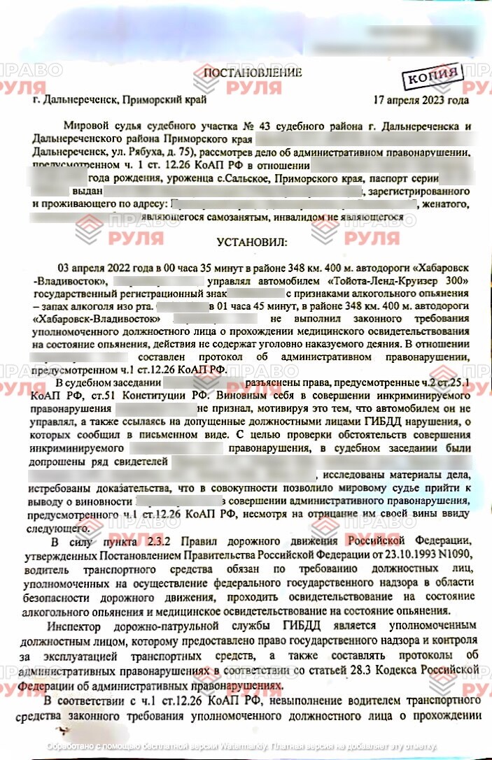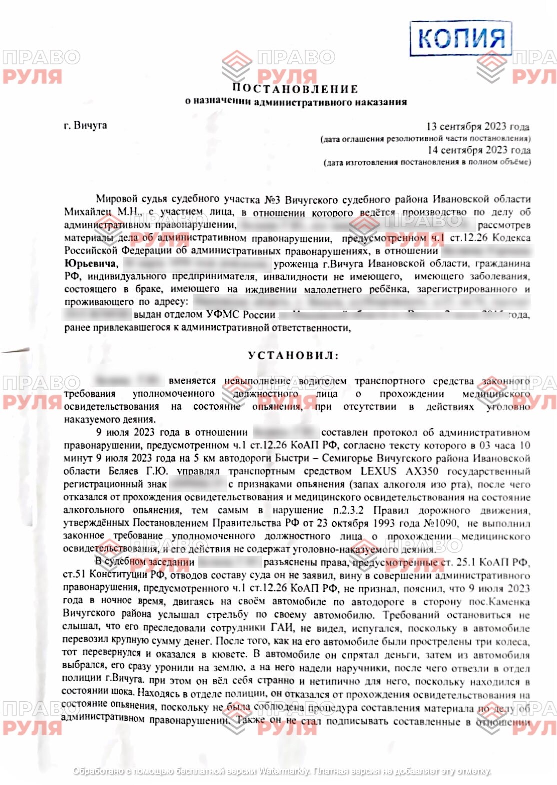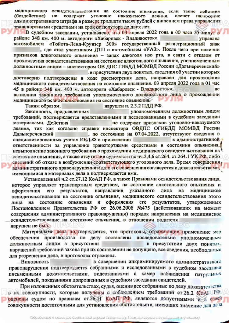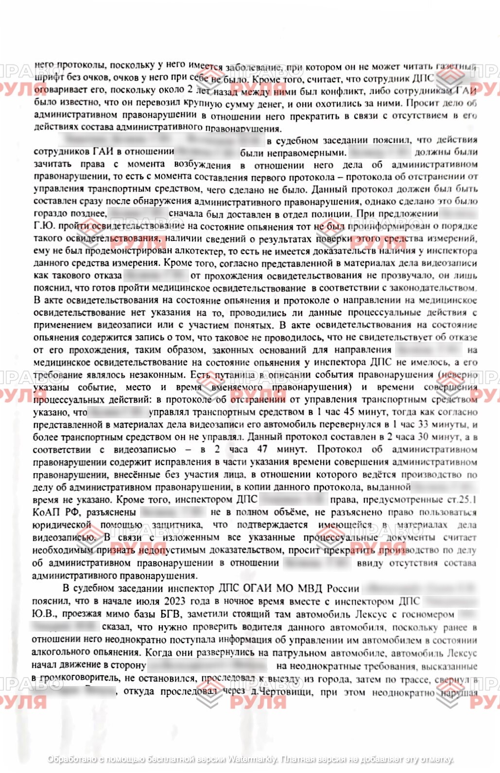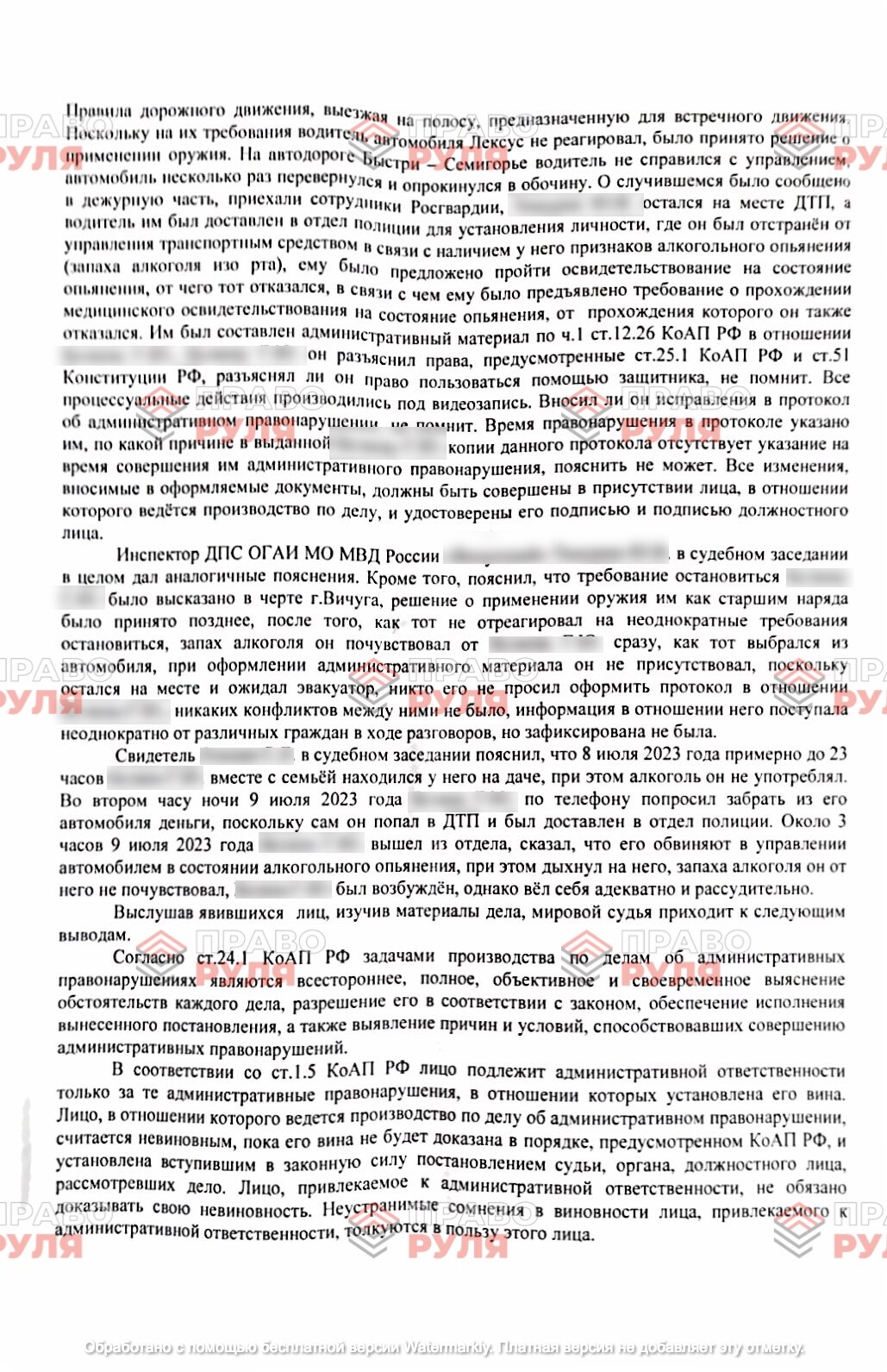 Клиент обратился 9 июля 2023 года в юридическую компанию Право Руля сразу после совершения правонарушения. Юристом оперативно был проведен анализ ситуации и выявлены нарушения инспектора ДПС в процедуре отстранения, а также в порядке прохождения мед. освидетельствования. При таких обстоятельствах привлечения лица к ответственности было незаконным. Суд 1ой инстанции встал на сторону клиента и признал его невиновным. Подробнее: в тексте решения.