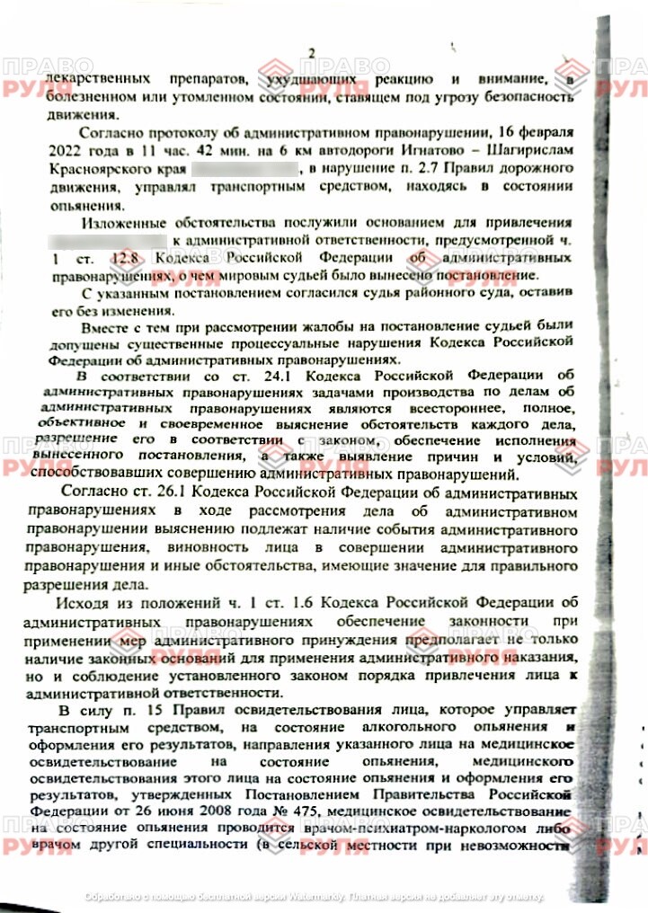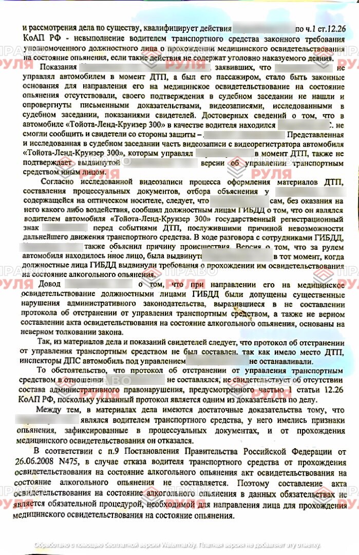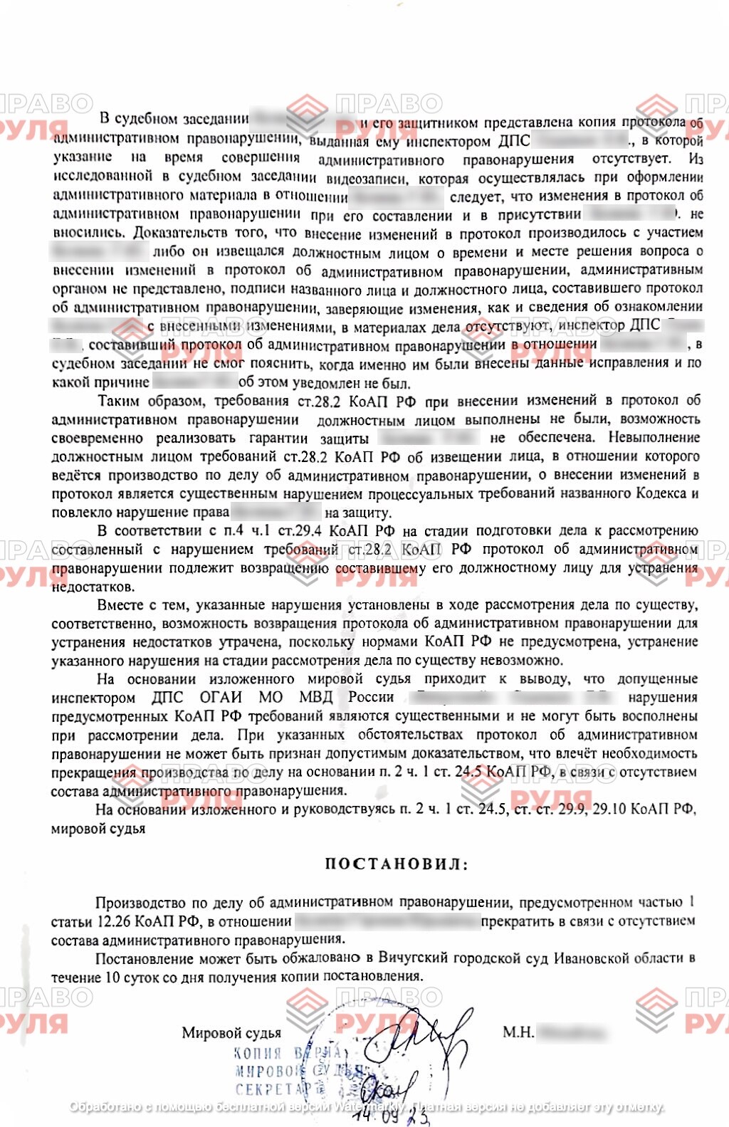 Клиент обратился 16 ноября 2023 года в юридическую компанию Право Руля в день совершения правонарушения. Юристом был подготовлен правовой анализ и найдены грубые нарушения в процедуре. При проведении процедуры отстранения не участвовали понятые и не проводилась видеофиксация. В связи с данным нарушением не был установлен субъект, установление которого необходимо для определения состава. Подробнее: в тексте решения.