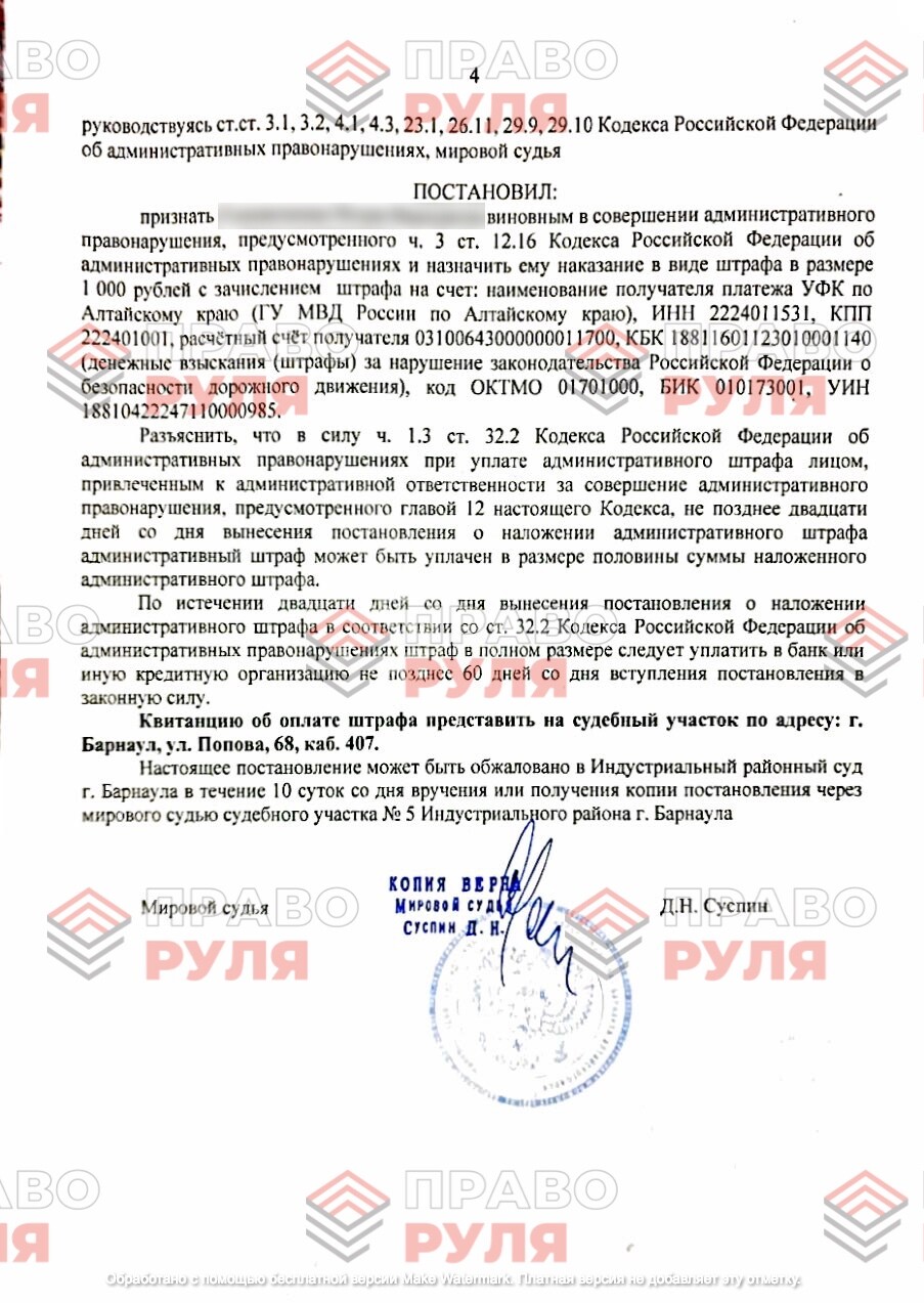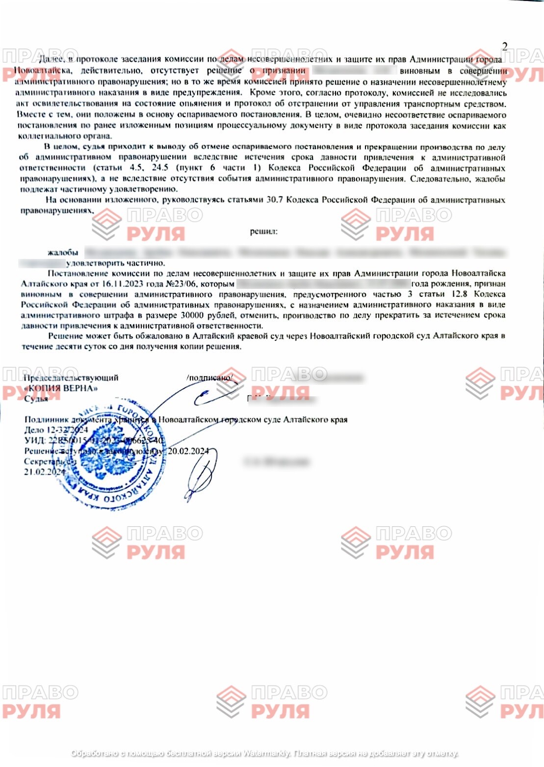 Клиент обратился 4 апреля 2023 года в юридическую компанию Право Руля на следующий день после совершения. Юристом была подготовлена позиция защиты с целью проведения дополнительных проверок по делу в связи с нарушениями. Во время проведения данных проверок истек срок привлечения к ответственности по вменяемому правонарушению. В итоге клиент был освобожден от ответственности в связи с истечением срока привлечения. Подробнее: в тексте решения.