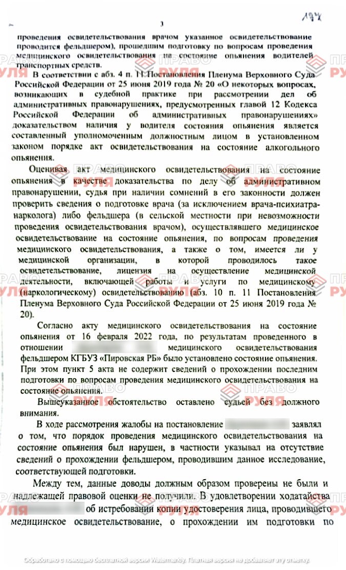Клиент обратился в юридическую компанию Право Руля после нарушения статьи 12.8 КоАП РФ. Юристом был подготовлен правовой анализ и найдено нарушение в процедуре медицинского освидетельствования. У фельдшера, который проводил освидетельствование не было подтверждения о прохождения специальной подготовки для допуска к проведению освидетельствования. Подробнее: в тексте решения.